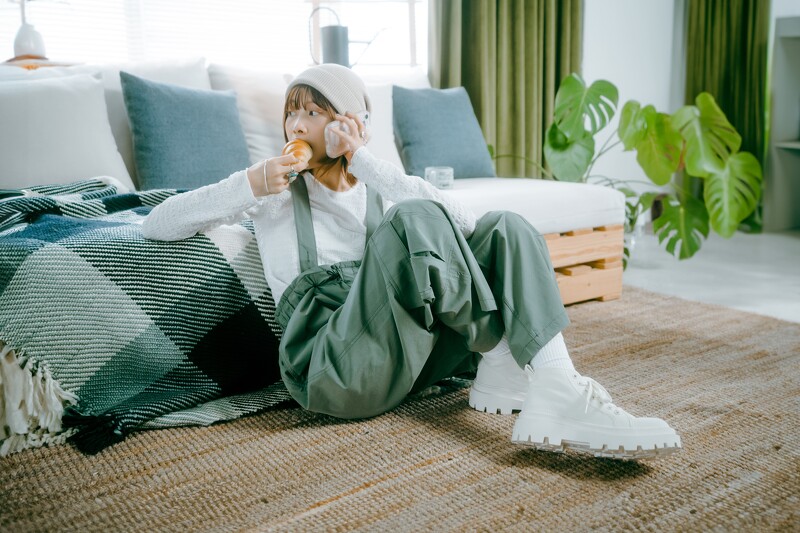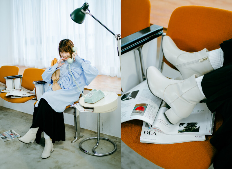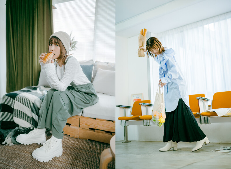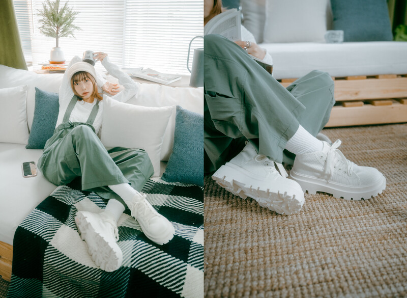 ABC-MART独卖的ALPINA CHUNKY鞋款,增高厚底高筒的帅气靴型,搭配上奶油白明亮色调,搭配KBF浅灰上衣与2 WAY卡其绿吊带裤,透过毛帽与ALPINA CHUNKY鞋款的头脚呼应浅色组合,让秋冬装扮也能拥有清爽不暗淡厚重的明快俏皮氛围。