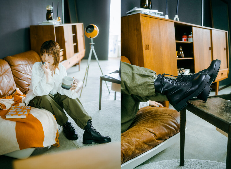 帅到犯规的黑色8-LACE UP 4.5绑带靴款,是时髦女生鞋柜中不能少的定番品,无论是与梦幻甜美单品混出甜酷并存的冲突美感,或是帅到破表的工作军装路线都很适合,另外像这样日常轻鬆以滚边缇花衬衫与复古感工作裤相衬,既能展现保留气质女孩的特点,也能呈现中性帅气魅力,入手保证不后悔!